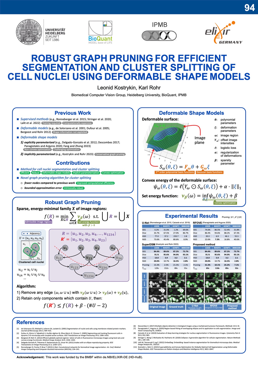 May 2024. Our conference paper “Robust Graph Pruning for Efficient Segmentation and Cluster Splitting of Cell Nuclei using Deformable Shape Models” has been presented at the IEEE ISBI 2024 in Athens, Greece. This contribution significantly improves the efficiency SuperDSM (our previously published method for cell nuclei segmentation, based on superadditivity and deformable shapre models).